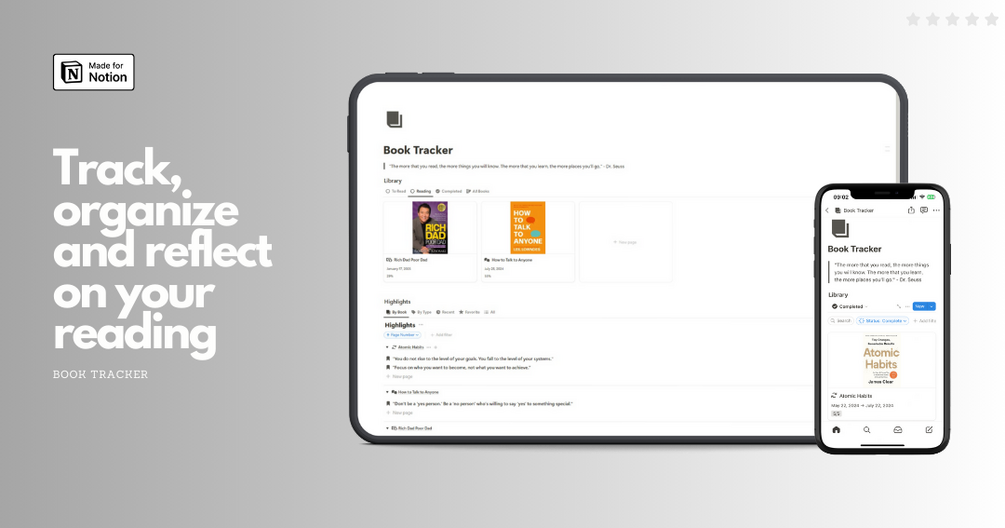 This Notion template is designed for readers who want to manage their books and highlights effortlessly. With a clean and functional design, this template includes two powerful databases: